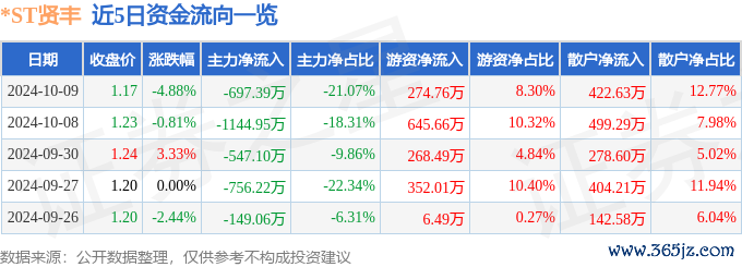 本站音问欧洲杯体育,罢了2024年10月9日收盘,*ST贤丰(002141)报收于1.17元,下降4.88%,换手率2.72%,成交量28.06万手,成交额3309.12万元。