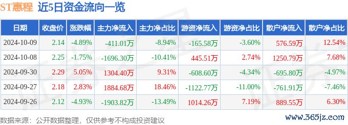 本站音问,章程2024年10月9日收盘,ST惠程(002168)报收于2.14元欧洲杯体育,下降4.89%,换手率2.72%,成交量21.36万手,成交额4597.49万元。