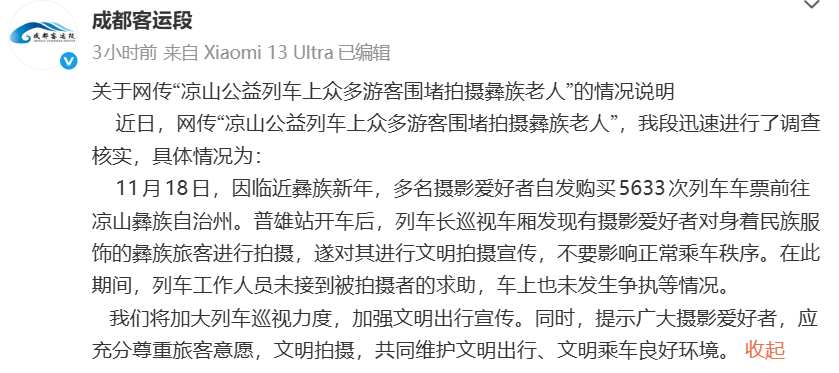 11月24日,@成齐客运段 发布对于网传“凉猴子益列车上重大游客围堵拍摄彝族老东谈主”的情况诠释,执行如下:
